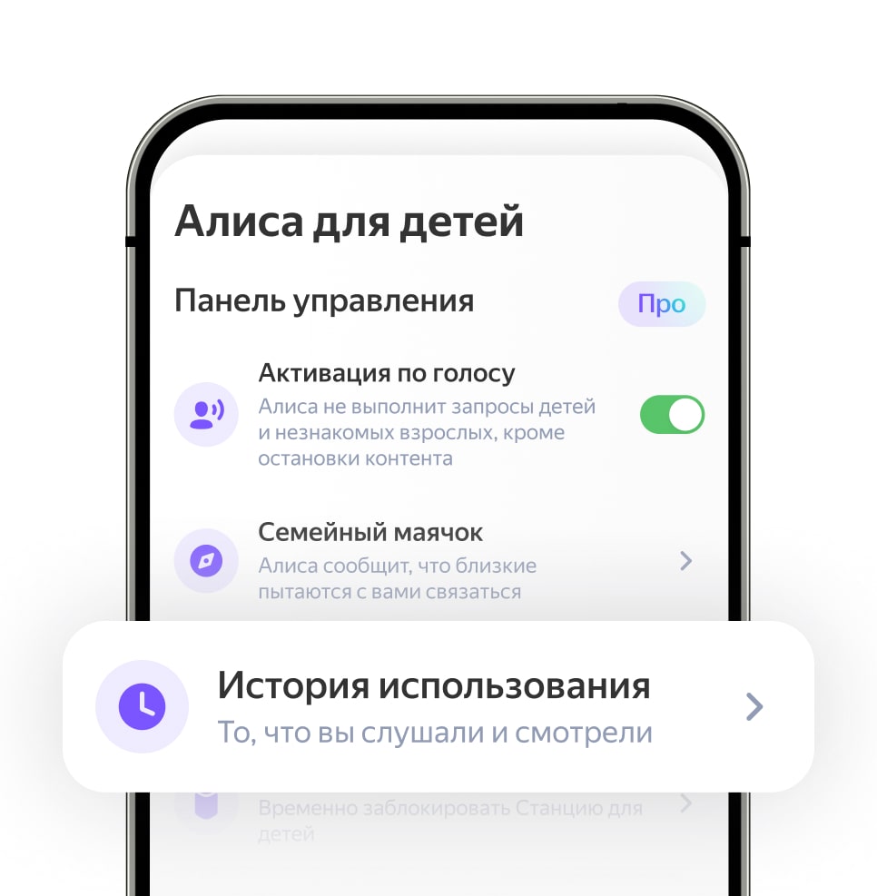 Если захотите узнать, что именно и как долго смотрели и слушали дети на Яндекс Станции или ТВ Станции, откройте раздел «История использования» в приложении Дом с Алисой.
