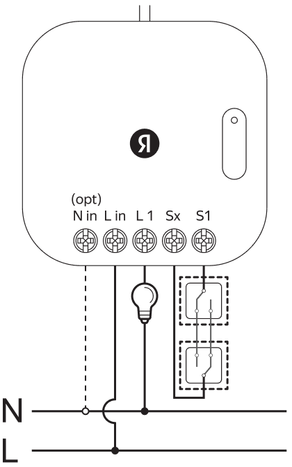 Если в доме уже установлены обычные проходные выключатели или вы планируете установить их на этапе ремонта, рекомендуем использовать умное реле Яндекса. С ним вы сможете управлять освещением не только нажатием, а также голосом, через приложение или сценарии. Посмотреть схему подключения.
