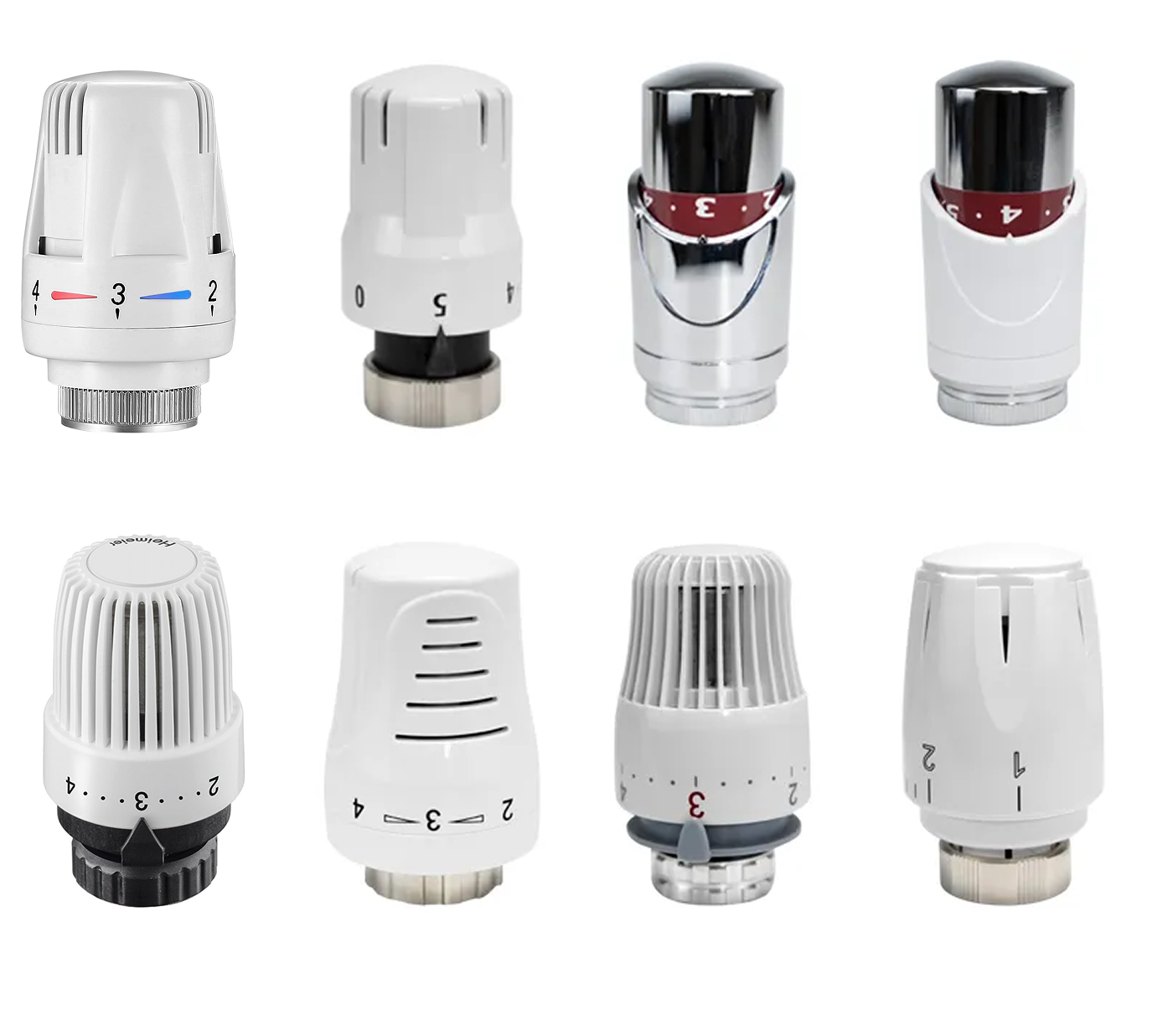 Термостатические клапаны, обычно имеют термоголовку с разметкой температур или цифрами, как на примерах ниже. Умный терморегулятор Яндекса подходит для большинства термостатических клапанов.